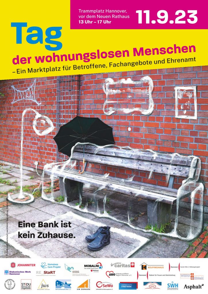 Ein Marktplatz für Betroffene, Fachangebote und Ehrenamt der Landeshauptstadt Hannover Der Bereich „Soziale Hilfen in Wohnungslosigkeit“ der Landeshauptstadt Hannover gestaltet mit Trägern der Wohnungsnotfallhilfe sowie ehrenamtlich organisierten Initiativen den „Tag der wohnungslosen Menschen“ am 11.9.23 ab 13 Uhr. Als Ziel sollen betroffenen Menschen, aber auch an dem Thema interessierten Personen,die Möglichkeit haben, sich über das […]