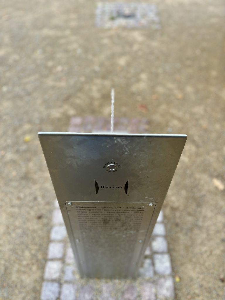 Der Brunnen gehört zum bewährten „Modell Hannover“, das bereits an vielen Stellen in der Stadt eingesetzt wird. Er besteht aus einer Edelstahlsäule mit integriertem Wasserauslass, auf dessen Rückseite in mehreren Sprachen auf die Bedeutung von Wasser hingewiesen wird. So wird die internationale Bedeutung dieser lebenswichtigen Ressource in den Vordergrund gestellt.