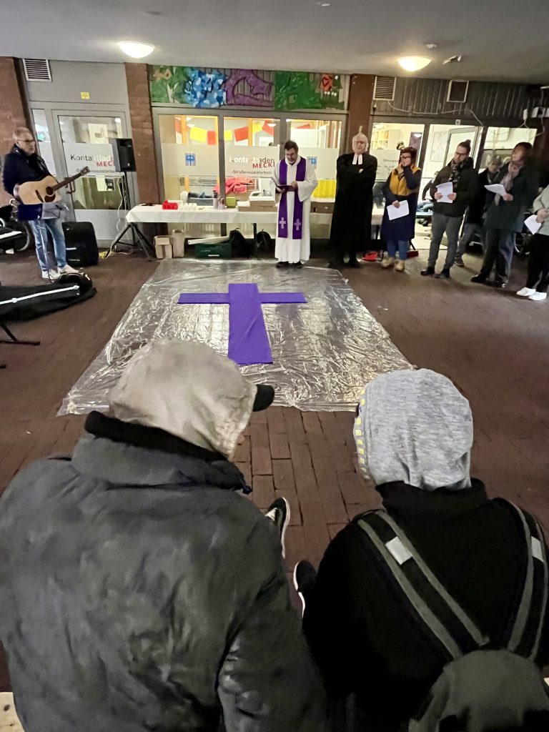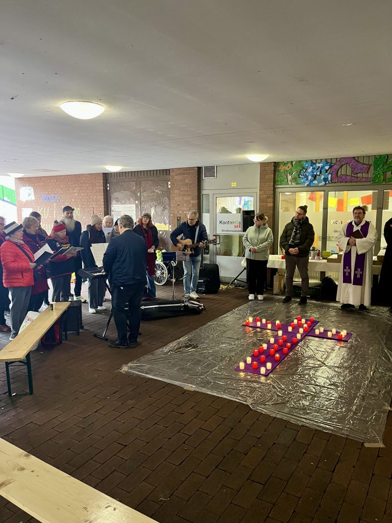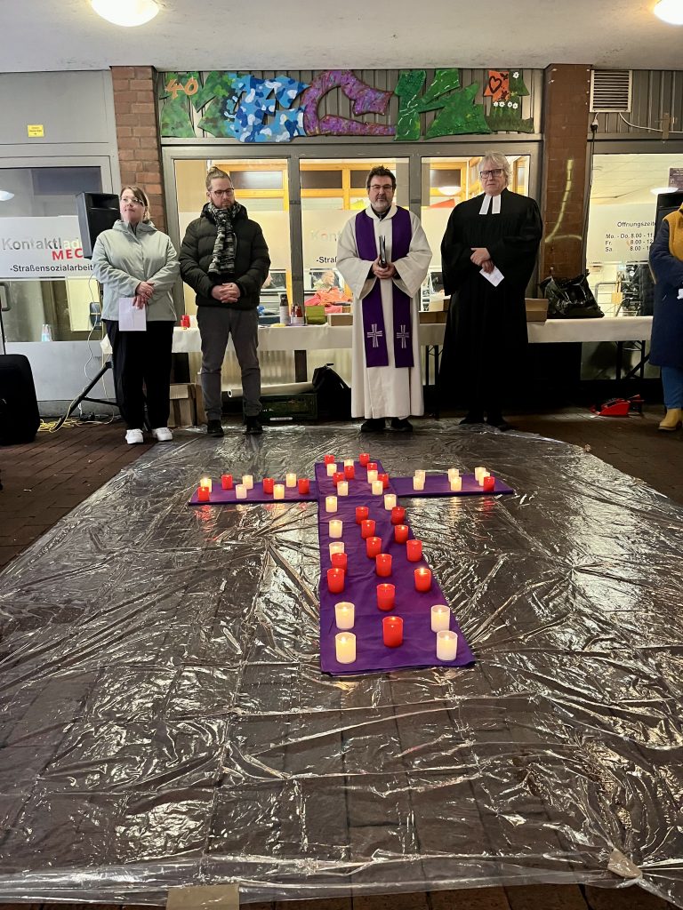 Die ökumenische Andacht am 10.11.2025 vor dem Kontaktladen Mecki bot deshalb mehr als einen Moment der Stille. Sie schuf Raum für Namen, Geschichten und Gedanken – für Menschen, die sonst ohne Begleitung gegangen wären. Diakoniepastor Friedhelm Feldkamp, Propst Wolfgang Semmet, Ramona Ligendza (Caritas), Jessica Bosse und Melanie Schlöndorf (Zentrale Beratungsstelle – Wohnungslosenhilfe) sowie Martin Skowronek (Caritas) stellten zum Zeichen des Gedenkens Kerzen auf ein Kreuz. Der Wohnungslosenchor begleitete die Andacht musikalisch und gab ihr eine besondere Stimmung.