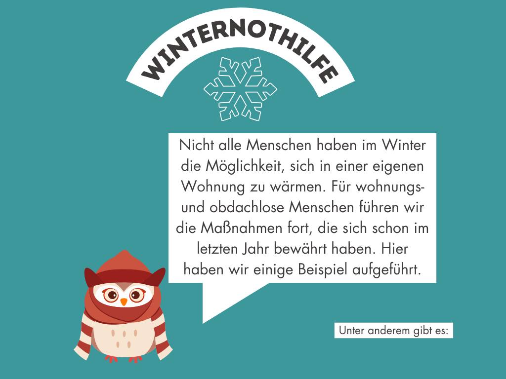 - Bei Temperaturen unter 0°C verlängern sich die Öffnungszeiten der Notschlafstellen von 16:00 bis 10:00 Uhr.